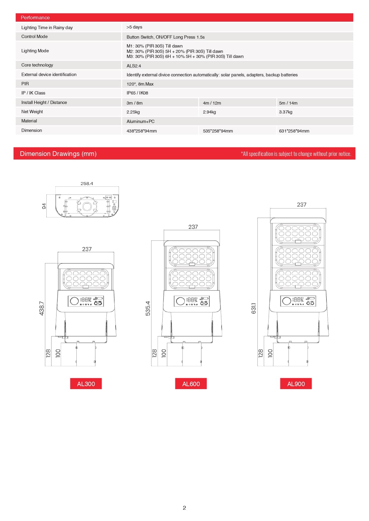 – Lighting Time in Rainy day: >5 days